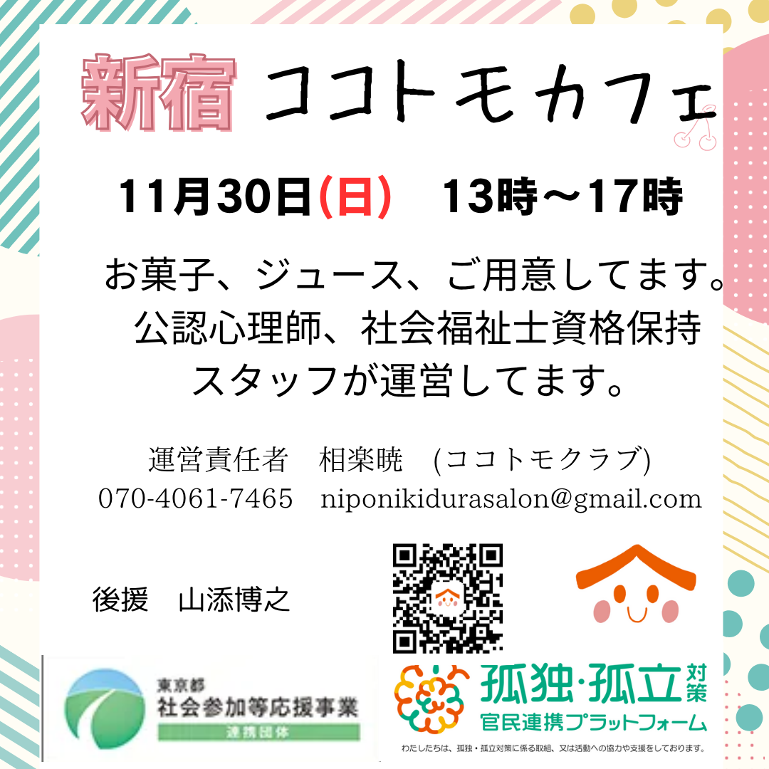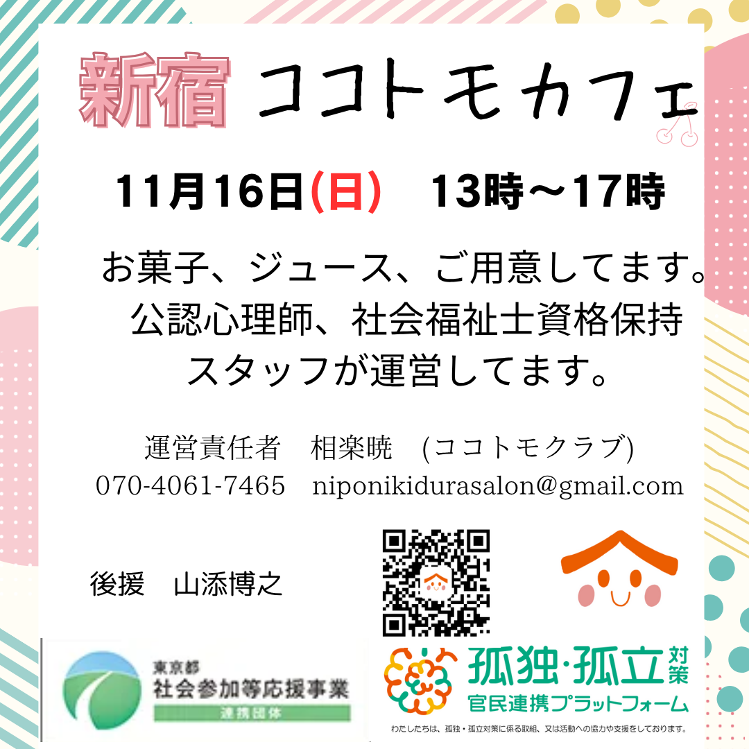 「普段安心して過ごせる居場所がない」「ちょっと疲れたな」と感じている方が、ほっと一息つける場所を作りました。 飲み物や軽食を用意して、気軽に立ち寄れる空間でお待ちしています。話したいことがあれば耳を傾ける仲間がいるし、ただ静かに過ごしたい人も大歓迎。 特に生きづらさを抱えている方、人見知りでお話が苦手な方などを歓迎致します。 住居がない方、生活が困窮している方は、代表&スタッフにぜひご相談下さい。 年間200回以上の自助会開催実績のあるココトモクラブに、トー横ができる遥か昔(90年代後半)からこの街に集っていた代表が本気で開催する会にぜひ遊びに来てください。 ※トラブル防止のため受付で連絡先の記入をお願いする場合もあります。 ※食べ物の持ち込みは大歓迎です。 11月の開催日 16日(日)13時~17時 30日(日)13時~17時 【会場】哲学対話バー Kisi 〒160-0021東京都新宿区歌舞伎町2-46-7 第3平沢ビル5F-B 西武新宿駅(北口) 徒歩2分 【参加費】 1,000円 (ココトモクラブオンラインサロン会員の方は参加費無料です) 別途店舗へドリンク代がかかります。